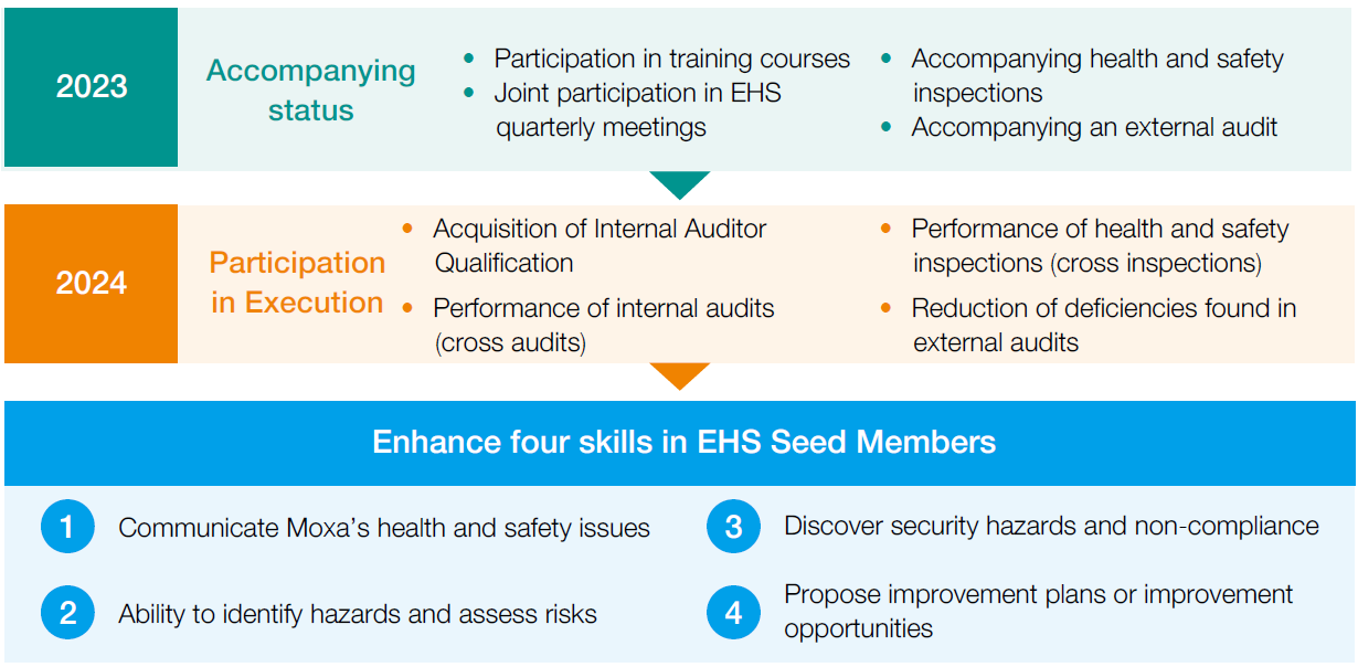 EHS Seed Members are responsible for conveying safety awareness and reminding employees of important tasks. In 2024, Moxa arranged for EHS Seed Members and related personnel (40 persons in total) to obtain the "EHS Management System - Internal Auditor" qualification. In addition, the focus of promotion for EHS Seed Members has shifted from "accompanying status" to "participating in implementation." They can actually participate in cross-departmental health and safety inspections and audits, which allows them to share excellent practices, learn new experience, improve the deficiencies of their own departments, further strengthen the safety and health awareness of all departments, establish consistent safety standards, thereby jointly promoting Moxa's safety culture. This will effectively reduce potential risks and increase overall safety awareness.