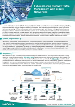 Advances in technology are evolving highway traffic management to enable traffic optimization, live monitoring of conditions, and rapid incident response—all of which enhance safety and operational efficiency. But to achieve this, a secure and intelligent ATMS network backbone is vital for reliable, non-stop operation of the entire system. Real-time data transmission is critical for CCTV surveillance, vehicle detection, and emergency response, and cybersecurity is essential to protect these systems from unauthorized access and ensure uninterrupted operations. Discover how Moxa’s solutions ensure reliable, secure, and scalable networking to futureproof highway ATMS infrastructure.