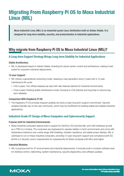 A long-term strategy for industrial applications is a must. That's why Moxa Industrial Linux (MIL) offers a reliable and secure solution built on a stable Debian architecture. This document outlines the key reasons for migrating your OS from Raspberry Pi, showing how MIL provides 10-year long-term support, robust cybersecurity, and a cost-effective design to address your toughest industrial challenges.