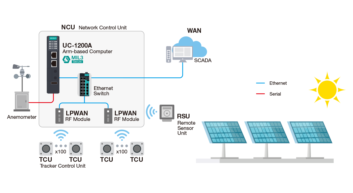 Moxa’s UC-1200A computer is deployed within the Network Control Unit (NCU) to preprocess data from the anemometer and transmit commands to the Tracker Control Unit (TCU). This communication is facilitated through connections with a switch and a Zigbee module, enabling efficient execution of commands. The UC-1200A is a 64-bit Arm-based computer compliant with the IEC 62443-4-2 SL2 security standard that offers data preprocessing, device monitoring, information transmission, and instruction provisioning, enabling seamless control of the solar tracking system.