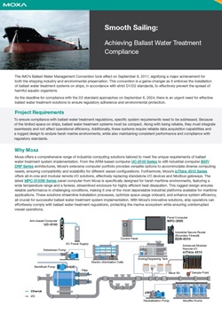 The IMO’s Ballast Water Management Convention mandates the installation of ballast water treatment systems on ships to prevent the spread of harmful aquatic organisms. With the D2 compliance deadline approaching on September 8, 2024, there's an urgent need for effective solutions. These systems must be compact, robust, and easily integrated into existing vessels, with reliable data acquisition and a rugged design that can withstand harsh marine conditions while meeting regulatory requirements. Discover our comprehensive solutions to meet these standards.