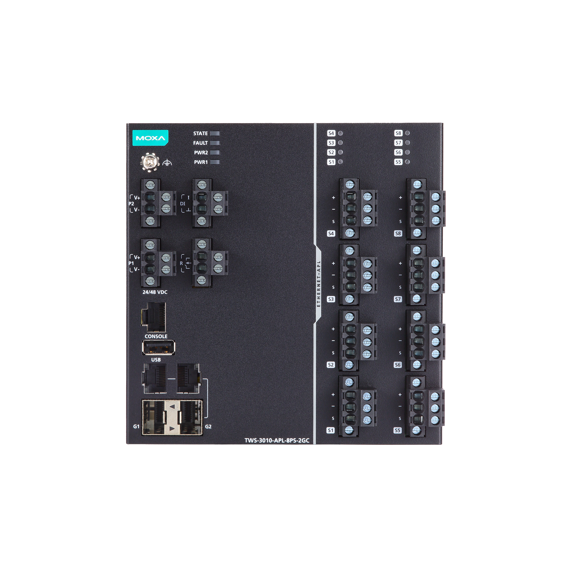 PWR1, PWR2, STATE, FAULT, Gigabit combo port, Ethernet-APL spur port