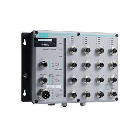Layer 2 managed switch with 16 10/100BaseT(X) ports, 2 10/100/1000BaseT(X) ports with M12 connectors, dual power input, 24-110 VDC, -40 to 75°C operating temperature, with KC certification