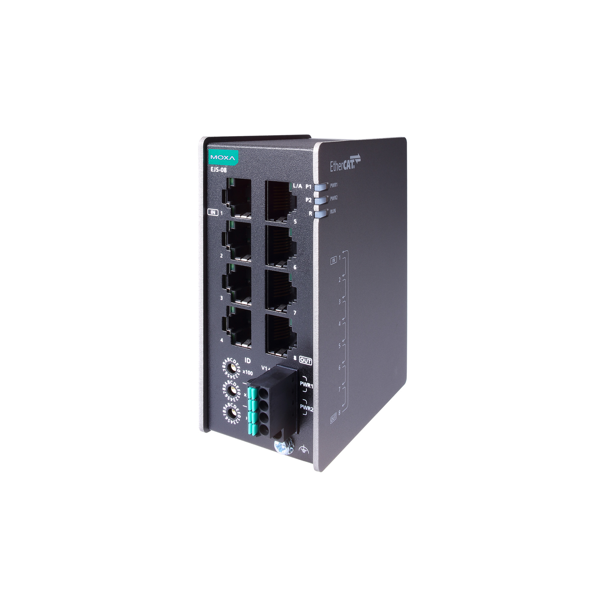 Moxa 的 EJS-08 系列 EtherCAT junctions 配備 8 個 100M EtherCAT 埠。這些裝置支援星型、線型、環型或樹型拓樸,可模組化高效串接多部 EtherCAT 裝置。EJS 系列採用高電磁相容性的堅固金屬外殼,能有效屏蔽環境干擾,同時支援多重接地方式,簡化佈線與安裝程序。